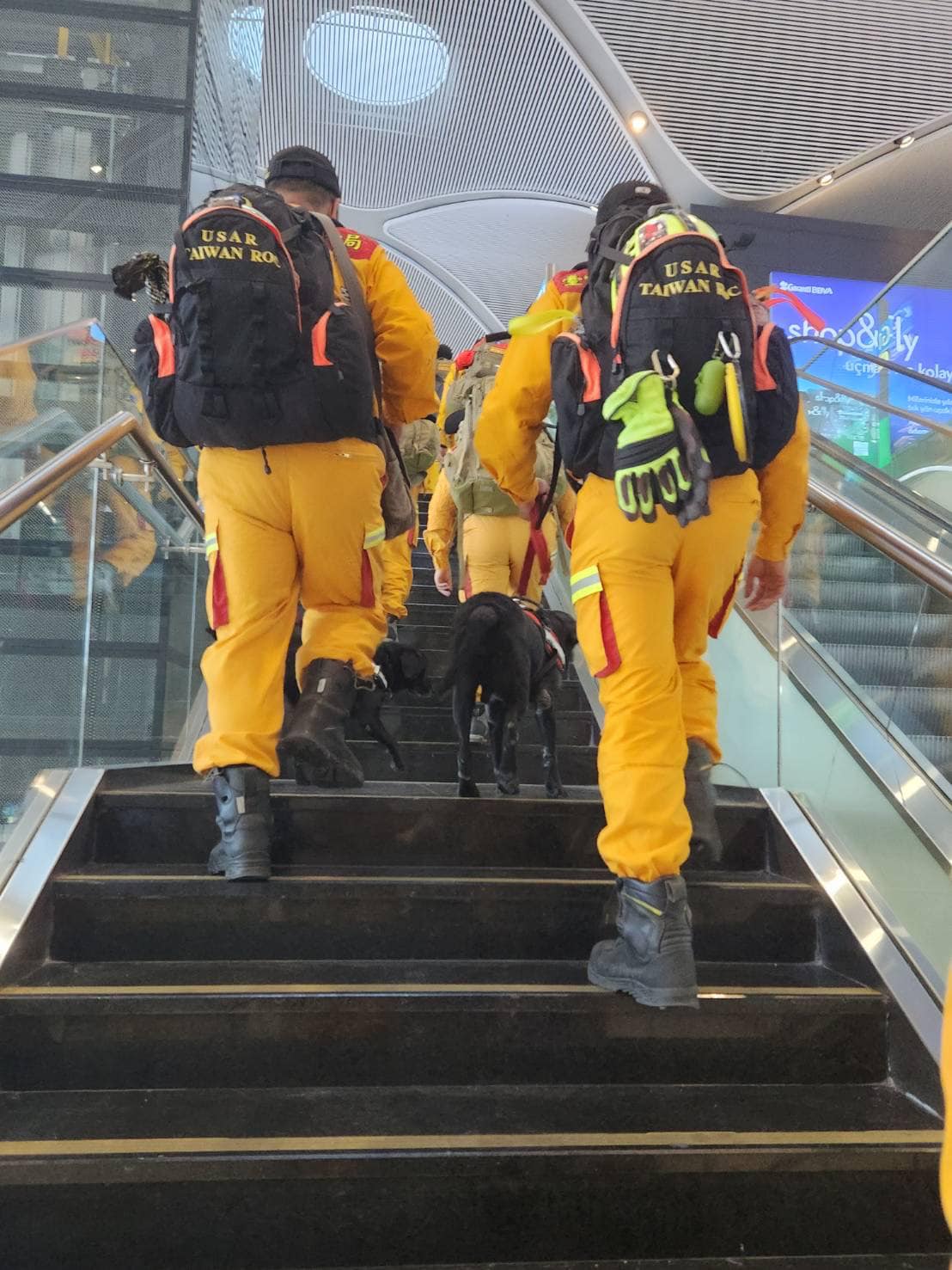 ▼粉專「臺中GoGo - 狗狗 -臺中搜救犬」貼出搜救團隊順利抵達土耳其的照片,臺中艦隊、臺中市政府消防局 、特搜大隊搜救犬隊及中興大學獸醫團隊皆已抵達土耳其,等待轉機當中。從畫面中可以看到,搜救犬「腿腿」和「Melody」身穿專屬的紅色背心,在領犬員的引導下緊緊跟在身旁,跟著夥伴們在機場轉機。