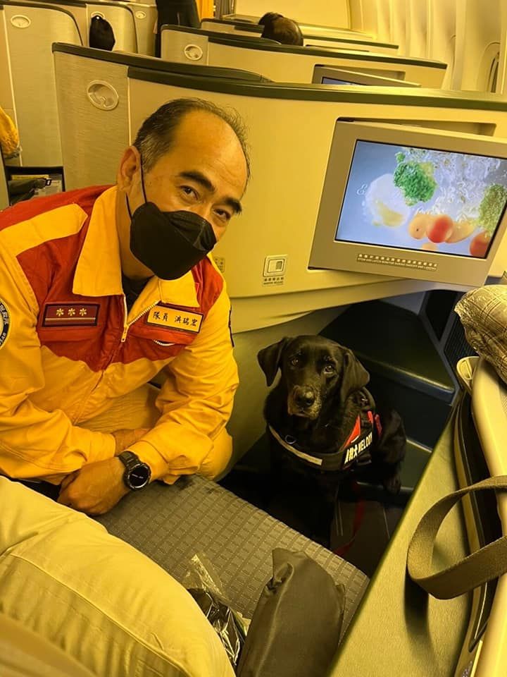 ▼第二批搜救隊是以包機的方式從桃園機場起飛,搜救犬們與領犬員一起坐在商務艙。從照片中可以看到,Melody和領犬員在一起,望著鏡頭露出呆萌的表情;腿腿則乖乖坐在領犬員旁準備登機,已經做好準備迎接即將到來的搜救任務。