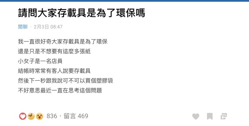 2023年09月03日現在許多人購物後會將發票存到手機載具。日前一名女網友在Dcard發文說,她目前在超商工作,平時結帳時,不少客人主動說要存載具,結果下秒要加購塑膠袋。這讓她非常納悶,不禁好奇問:「大家存載具是為了環保?還是只是不想要有這麼多張紙?最近一直在思考這個問題。」