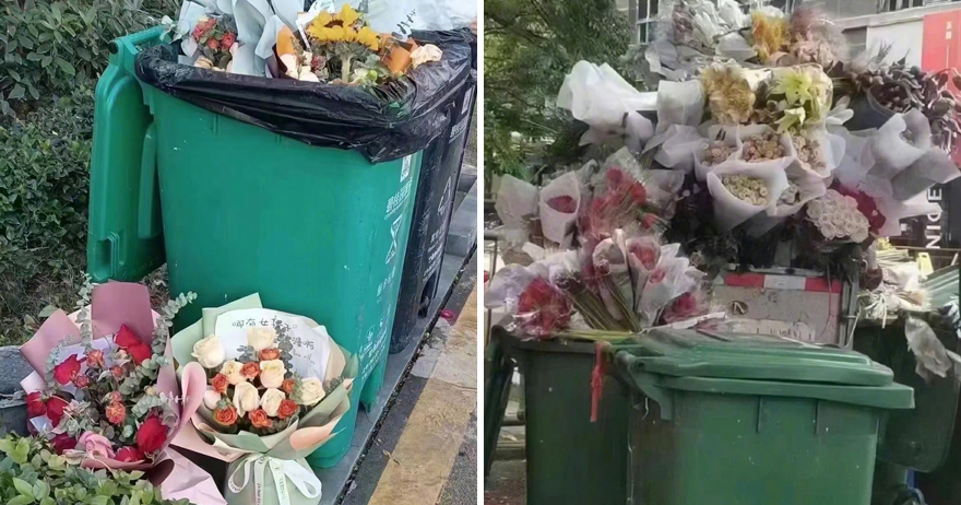 悲傷情人節!路邊垃圾桶塞滿鮮花 網嘆:又多幾個心碎的