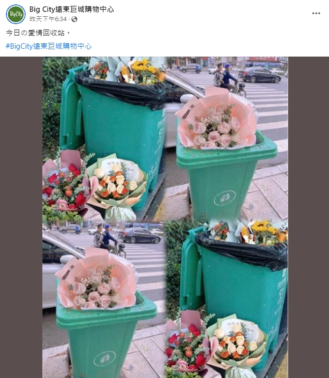 2023年02月16日西洋情人節剛剛過去,很多人選擇在這一天向心上人表白,但並不是每一個人都能心想事成。新竹的巨城購物中心粉專「Big City遠東巨城購物中心」分享了一張照片,只見路邊的垃圾桶中塞滿各色鮮花,網友們看到後感嘆「新竹沒有愛情」。