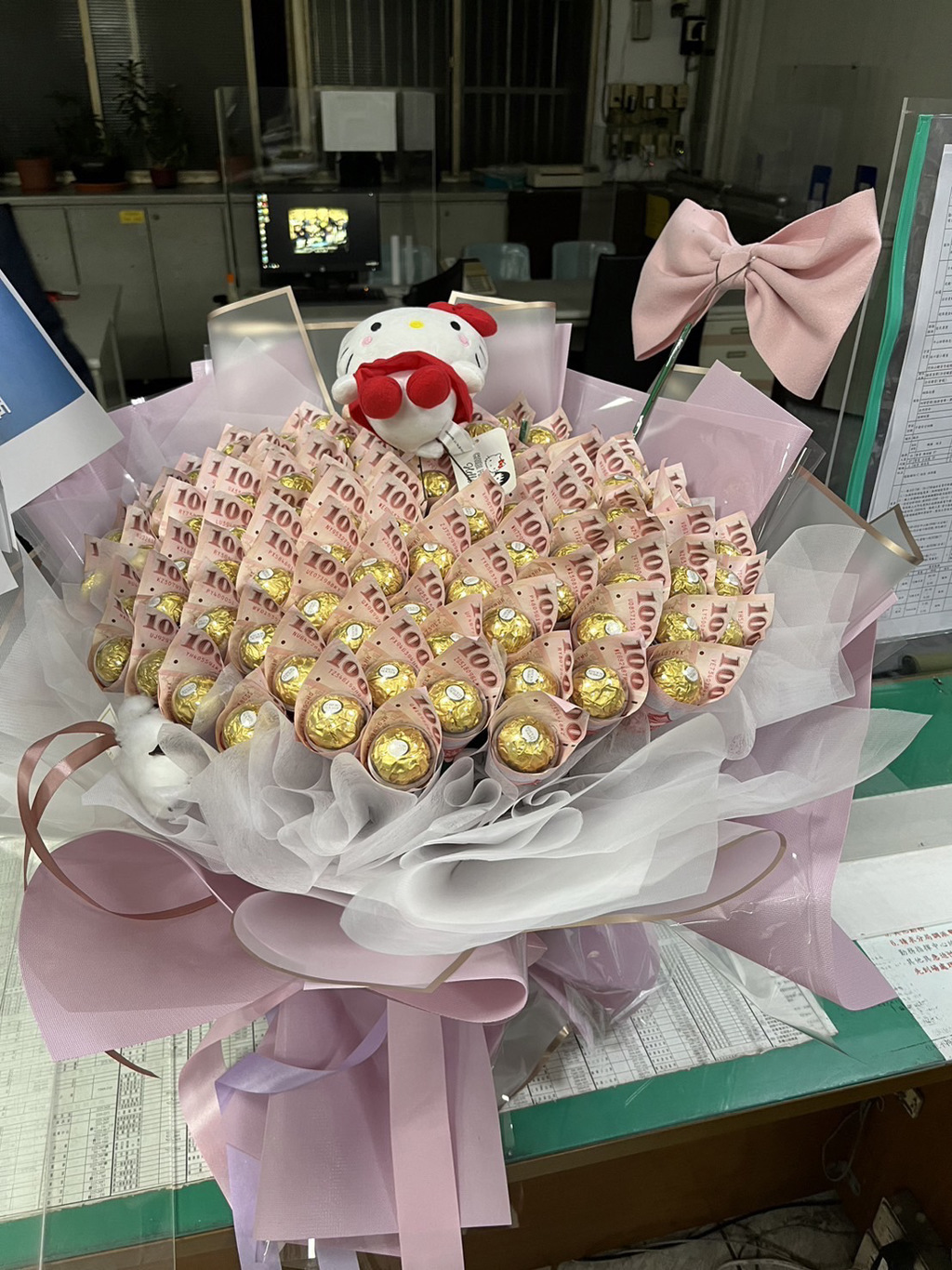 2月14日西洋情人節,一對男女行經新北市林口國小側門時,在路邊撿到一束用百元鈔票和金莎巧克力裝飾的花束,於是送到了派出所。受理員警用手機拍照,然後上傳到臉書社群「林口大家庭」並貼文說,拾獲者是在林口國小附近撿到這項物品,若是有民眾不慎遺失該物品,請與林口分局林口派出所聯繫。