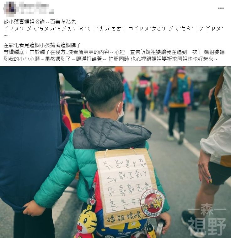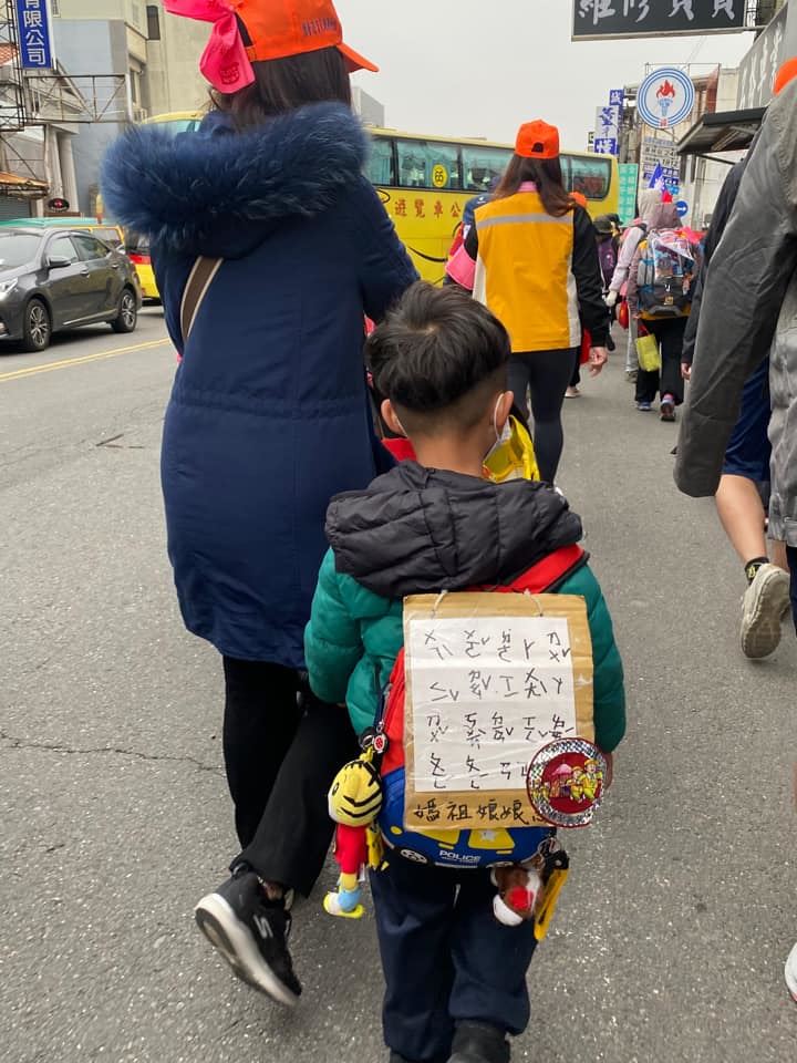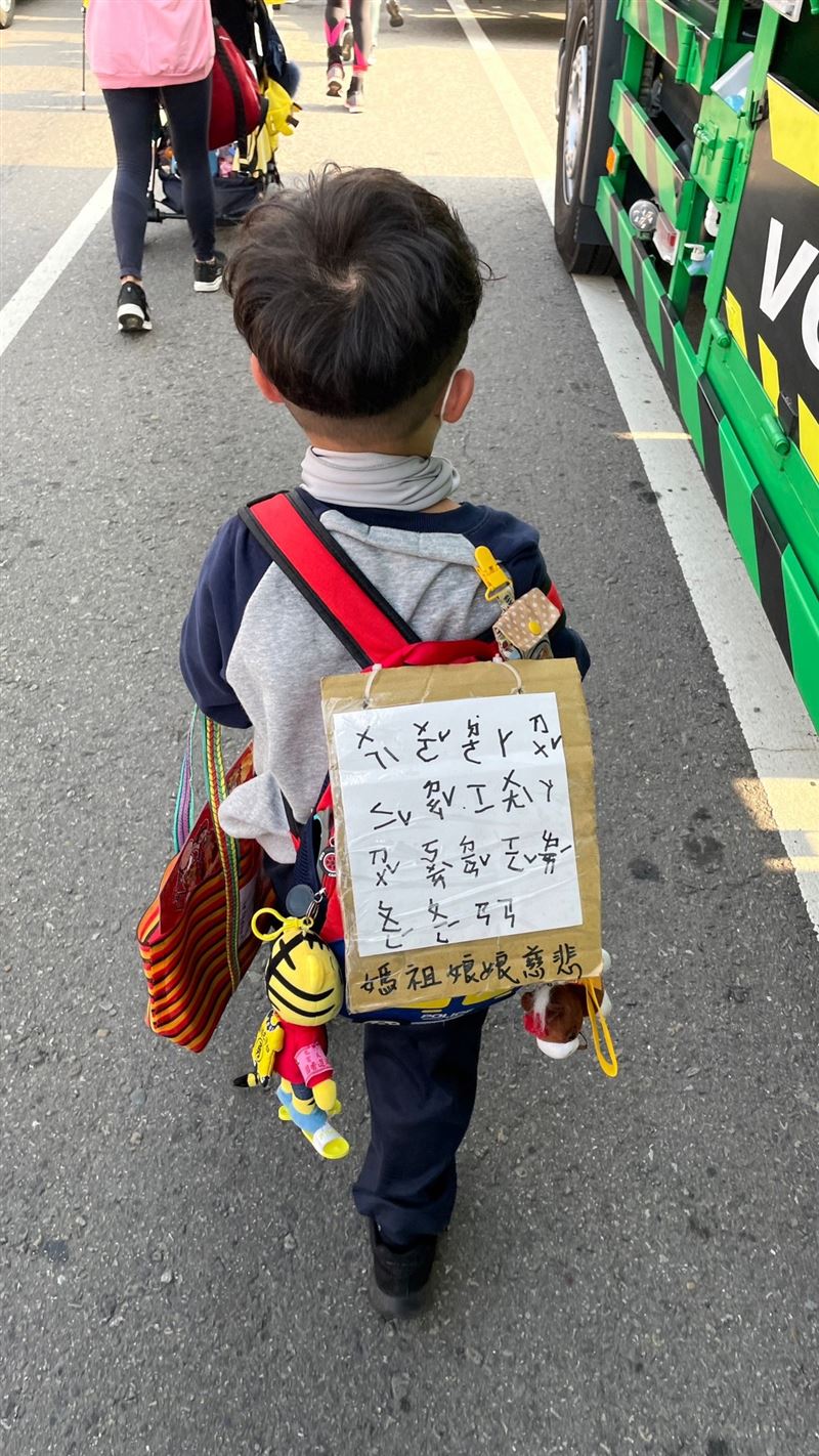 ▼從照片中可以看到,一名年約5、6歲的小男孩抓著家人的衣服,徒步走在進香隊伍中。他背著書包,包上還用束帶掛著一塊厚紙板,上面用奇異筆寫注音:「為我的阿祖祈禱,希望阿祖快點醒來,平平安安。」原來這個小朋友是在替阿祖祈福。
