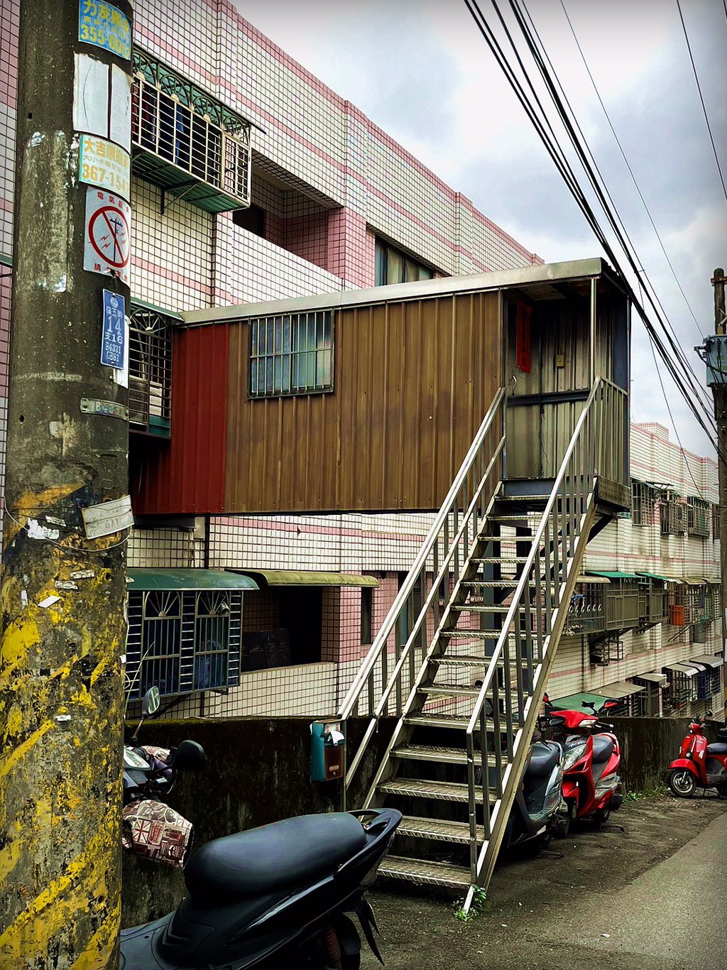 原po在臉書社團「路上觀察學院」貼出照片,這張照片是在桃園市龜山區幸美街上拍的,從照片中可以看到,一整排公寓住宅其中1戶住宅後陽台改建,拉出如同飛機空橋的通道,直接連到坡道上。原po開玩笑說:「退役飛機空橋辛酸照流出。」