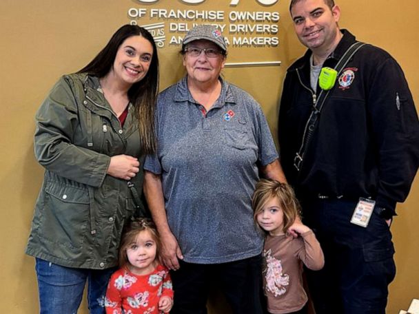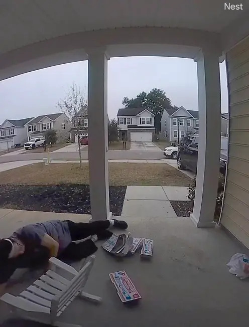 ▼今年2月3日,南卡羅來納州的一個家庭點了達美樂披薩後,由72歲的外送員Barbara Gillespie進行配送。沒想到她抵達顧客家門口,上台階時一腳踩空,直接踉蹌摔倒在地,手中的餐盒也散落一地。