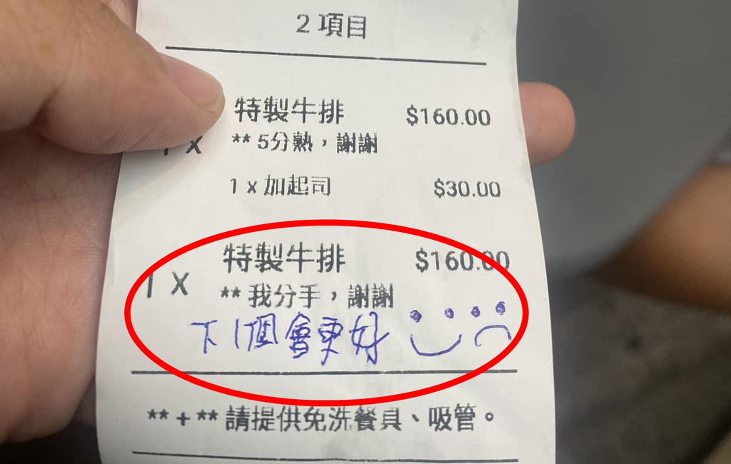 原po在臉書社團「爆廢公社二館」分享說,日前她用外送平台點了2份牛排,收到餐點時,發現外送單上寫著「下一個會更好」。她一頭霧水,仔細一看,原來是她在其中1份牛排的備註欄寫「我分手,謝謝」,但她其實是要寫「5分熟,謝謝」,當時她用注音打字,只打了「ㄨㄈㄕ」,又一時大意選錯字,才會變成「我分手」。