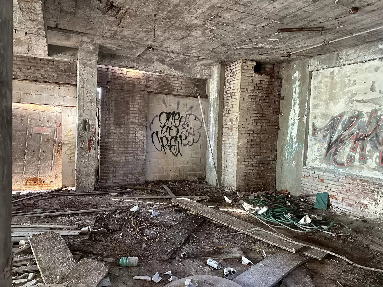 ▼兩人沿著小路走到盡頭,看到一棟廢棄建築,旁邊還有一片農田。她們認為狗狗很可能生活在這棟多層廢棄建築裡,於是進去尋找,果然看到了那隻狗狗。牠正趴在一條髒兮兮的毯子上,那應該就是牠的全部物品來了。