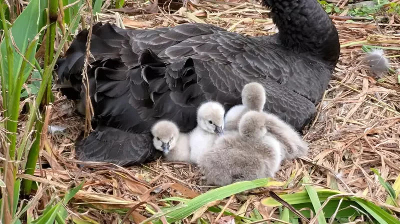 2023年03月07日去年7月,台中市秋紅谷景觀生態公園喜迎2對黑天鵝入住,今年1月傳出黑天鵝下蛋的好消息。黑天鵝爸媽輪流孵蛋1個多月,本月22日至23日凌晨,5隻黑天鵝寶寶順利破殼,剛剛出生的小天鵝非常可愛!台中市建設局長陳大田提醒說,小天鵝剛孵化,請勿靠近、餵食,一同愛護小天鵝~