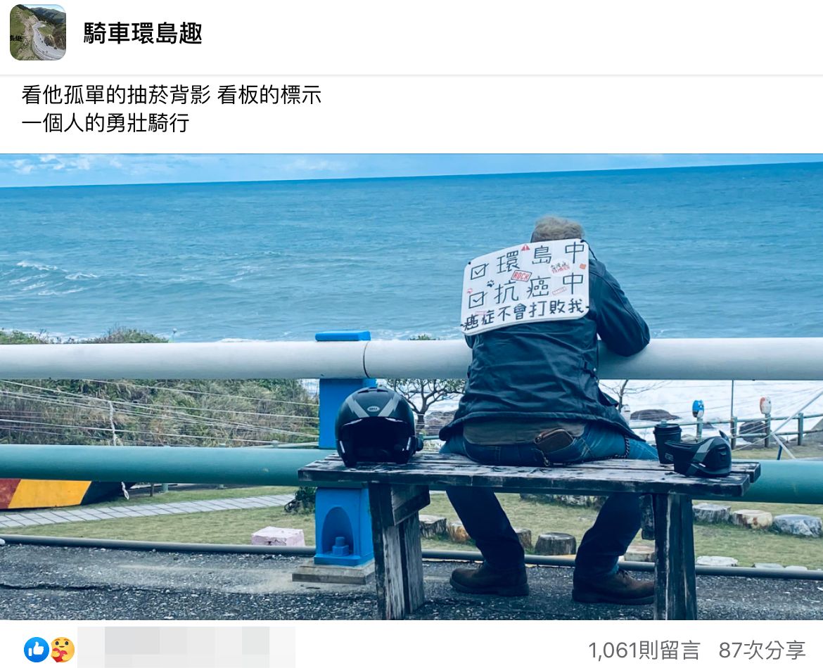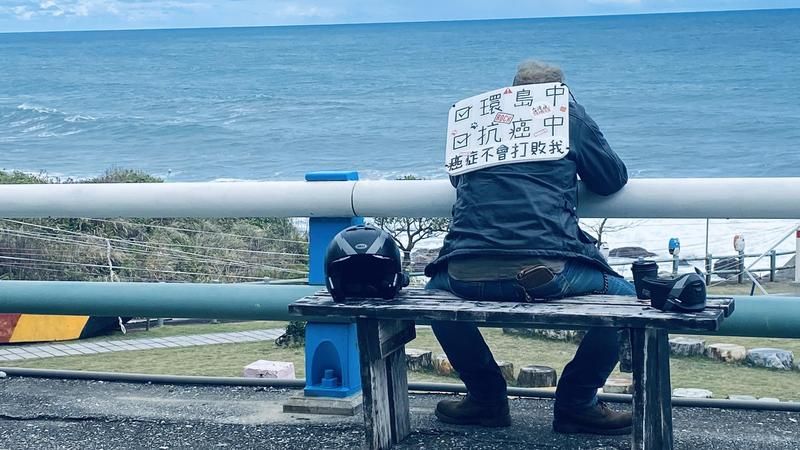 一名網友在臉書社團「騎車環島趣」分享一張照片,並發文說:「看他孤單的抽菸背影,看板的標示,一個人的勇壯騎行。」這張照片是在花蓮的親不知子天空步道拍攝的,只見一名男子坐在長椅上看海,他身旁放著安全帽、腰包和一杯咖啡,背上的瓦楞板上則寫著「環島中」「抗癌中」「癌症不會打敗我」等字句。