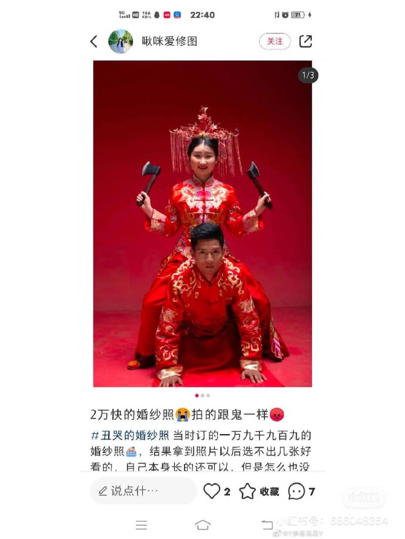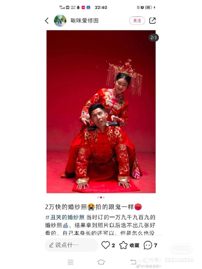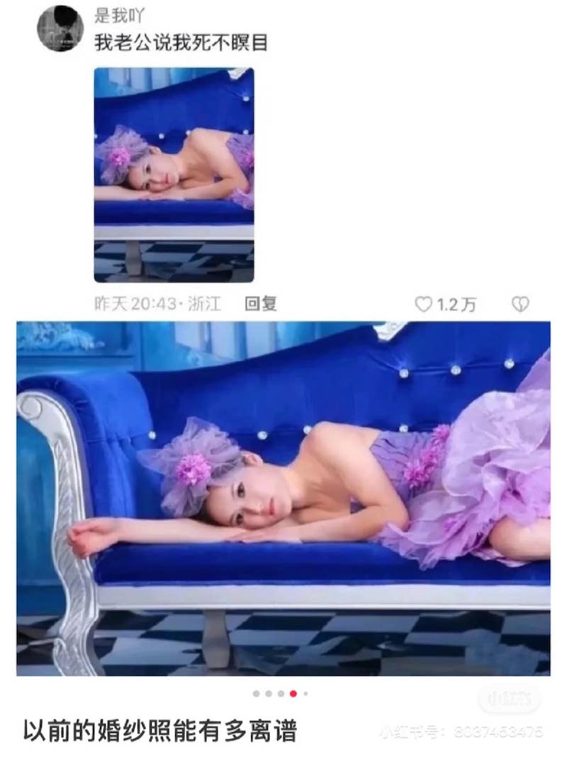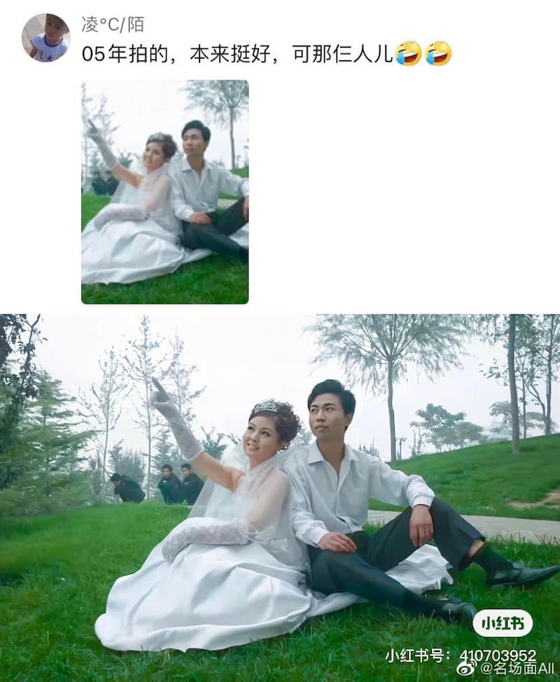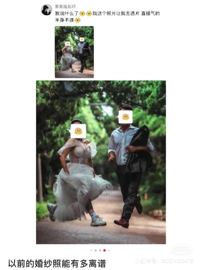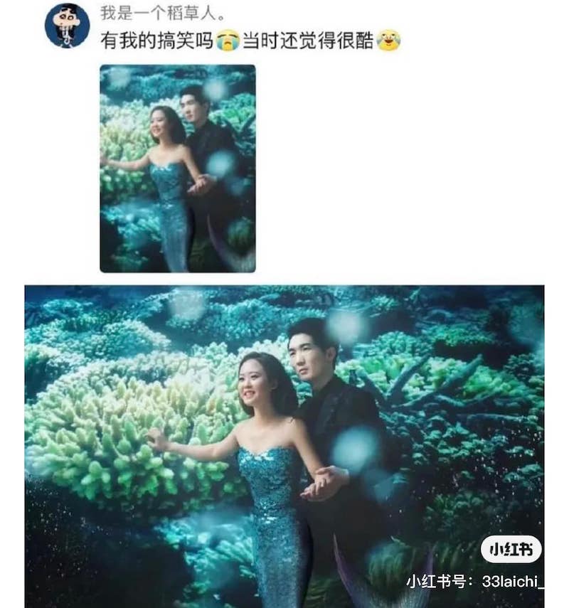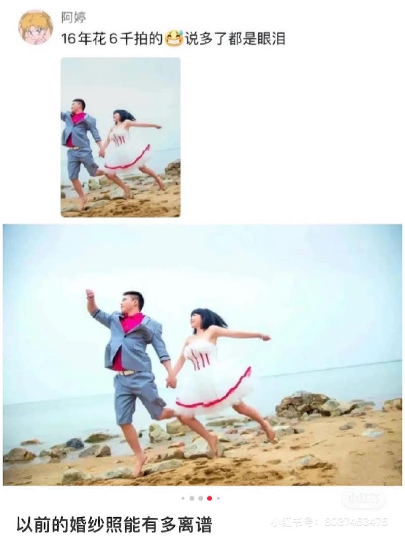 2023年03月01日現在很多新人結婚時都會去拍婚紗照,原本是想永久留念,過幾年再看卻覺得非常好笑。一些網友分享自己早些年拍的婚紗照,有的風格詭異、有的服裝搭配特別,讓人直呼看不懂。大家看到後忍不住笑說:「完全不理解攝影師的思路!」