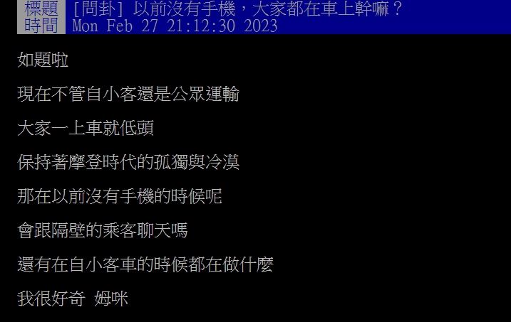 ▼原po在PTT發文說,現在不管是自小客車還是公眾運輸,人們只要一上車就低頭玩手機,「保持著摩登時代的孤獨與冷漠」。他非常好奇,在以前沒有手機的時候,大家會跟隔壁的乘客聊天嗎?還有在自小客車的時候都在做什麼?