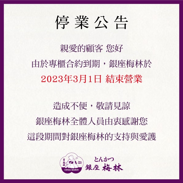 ▼2020年3月,銀座梅林豬排宣布進駐台灣新竹,很快就成為當地人最喜愛的炸豬排店。沒想到官方臉書本月1日突然在臉書公告結束營業的消息,表示由於專櫃合約到期,即刻起結束營業,並感謝顧客多年來的支持與愛護。