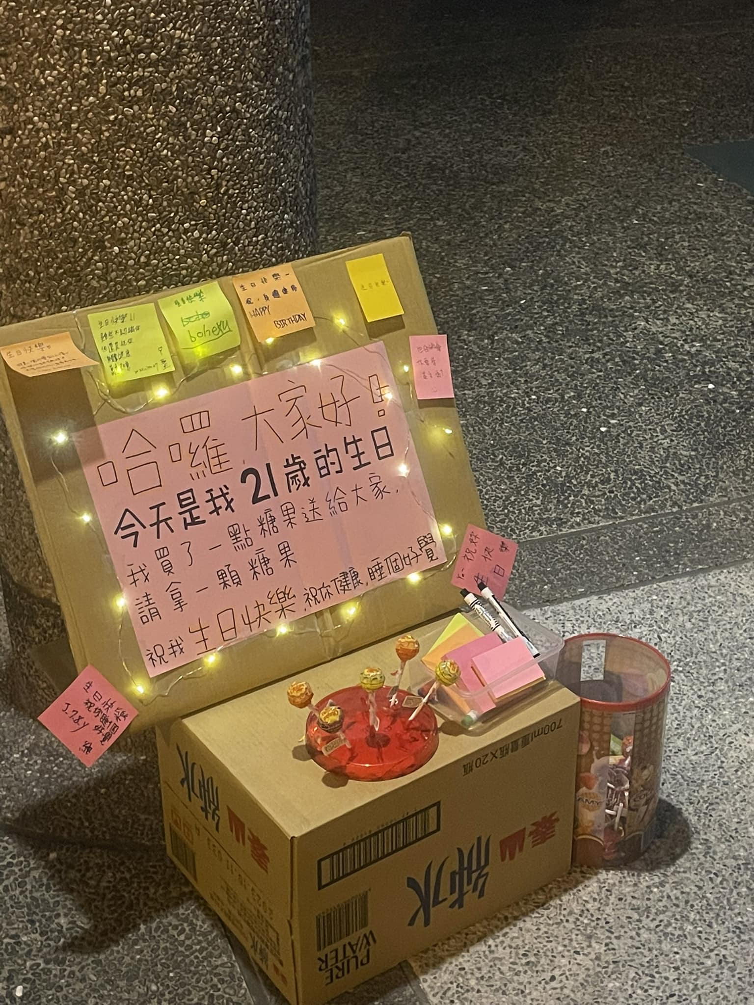 ▼原po分享了一張照片,並表示自己某天在路邊看到地上有一個紙箱,上面除了許多棒棒糖,還有溫暖的字句:「哈囉大家好!今天是我21歲的生日,我買了一點糖果送給大家,請拿一顆糖果,祝我生日快樂,祝你健康睡個好覺!」旁邊還放著奇異筆和便利貼,開放路人給予祝福。