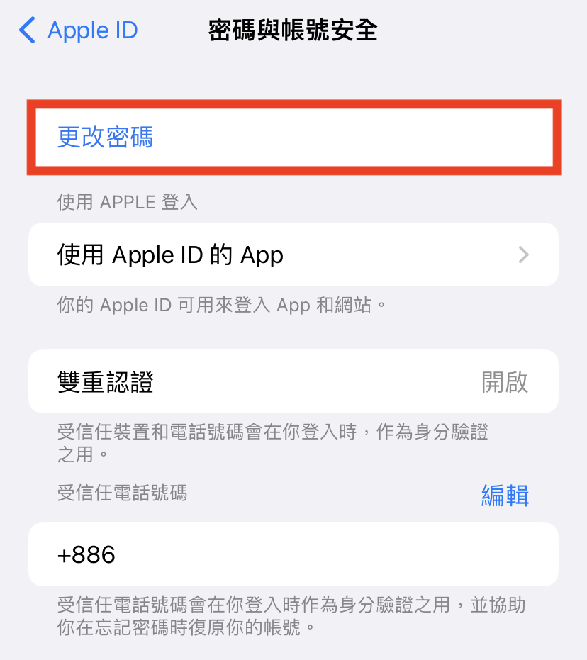 點擊「不允許」後,還要立刻更改Apple ID密碼,並透過以下5步驟,快速解決Apple ID帳號被盜用的問題: