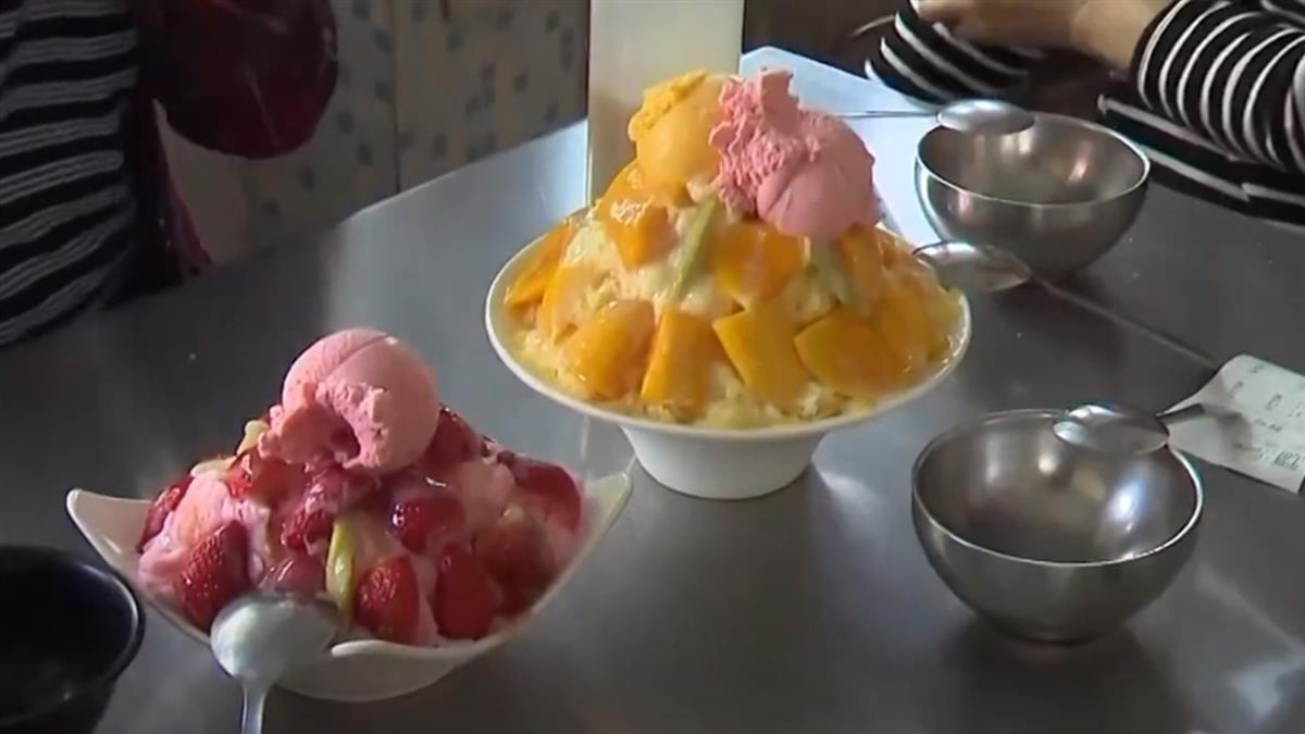 黃澄澄的芒果雪花冰裝滿大碗公,再鋪上新鮮芒果,還有酸酸甜甜的草莓、情人果,最後淋上煉乳。很多人來到台南玉井都會吃上一碗芒果冰,幾個人點不同的口味,最後一起分食,多種口味都能吃得到。
