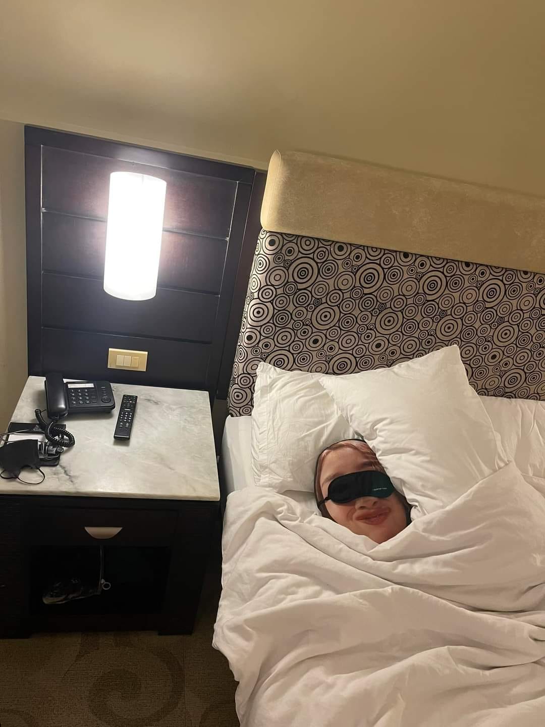 ▼入住飯店時,抱枕更是陪伴在Raymond身邊。Raymond還貼心給抱枕戴上眼罩。