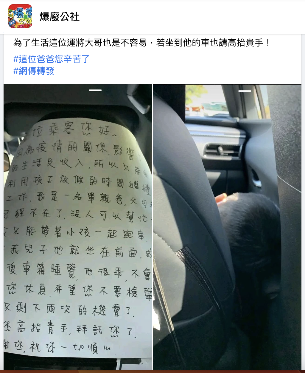 ▼原po在臉書社團「爆廢公社」貼出一張照片,這是一張貼在計程車副駕駛座椅背上的告示,上面是司機大哥的自述。他是一名單親爸爸,因為雙親都已過世,家中沒人能幫忙顧小孩,但家庭經濟重擔壓在他身上,只能趁孩子休假期間帶著他繼續工作。