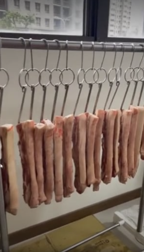 ▼還有網友注意到直播中的細節:「聽說館長便當工廠的設備斥資千萬以上,想必相當先進又衛生,但剛看別人分享影片截圖,豬肉直接吊在伸縮衣架上吹電扇,背景看起來就像一般民房,這就是館長千萬級的設備嗎?」