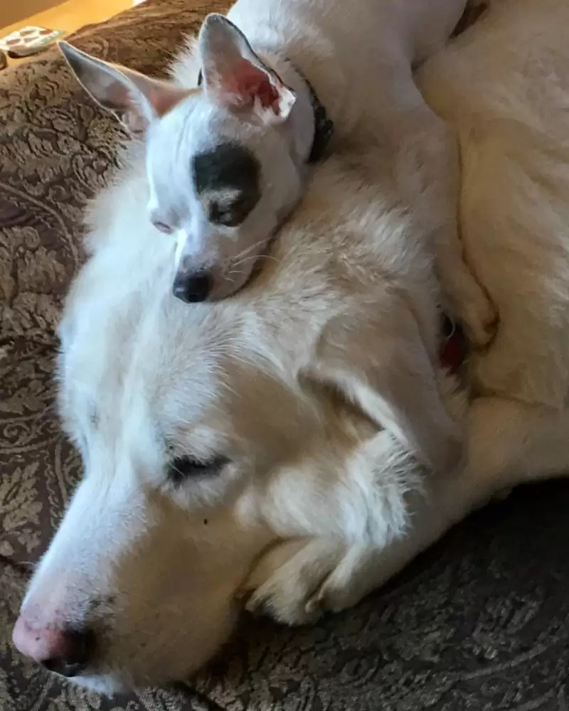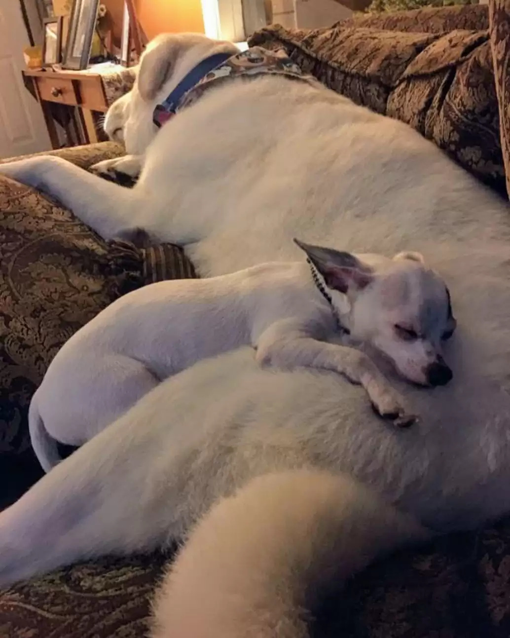 2023年03月25日國外飼主Jenny Leech家中養了2隻狗狗,分別是體型較大的Ben和小巧可愛的Tim。Ben從小就在這個家庭中長大,而Tim是2016年時才加入進來的。2隻狗狗很快就成為好朋友,每天形影不離。Tim超愛趴在Ben的身上休息,Ben也不介意,任由對方把自己當成睡墊~