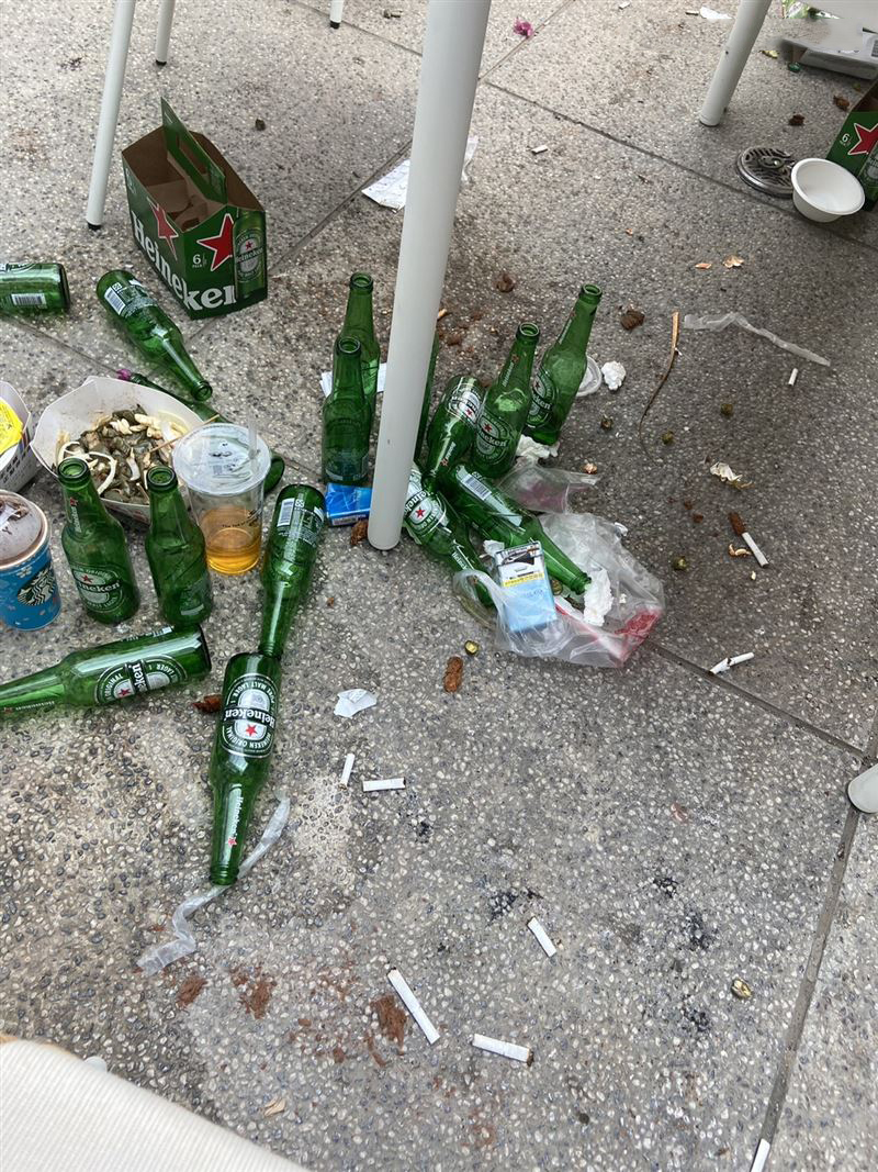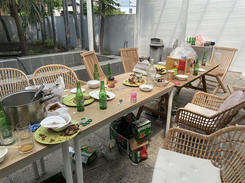 ▼蘇小姐表示,她走進別墅後當場傻眼,整個屋內像是被炸過一樣,烤肉物品沒有收,沒吃完的食物、海鮮被扔在桌上曝曬,已經飄出酸臭味,喝完的空酒瓶更是隨意扔在地上。她打掃了2.5個小時才清完一個區域,地上的檳榔汁、室內超重的菸味還沒有處理,根本無法順利接下一組客人。