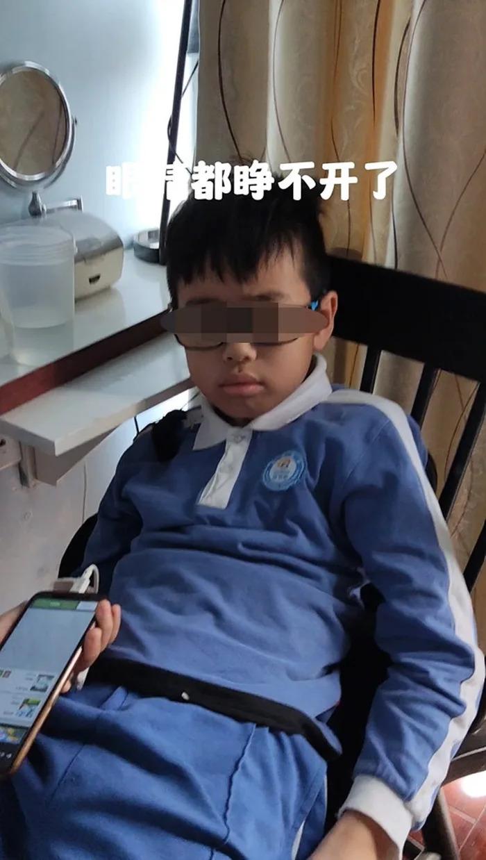 ▼黃父決定給兒子請一天假,讓他自由玩。最初兒子很開心,馬上拿起手機玩起遊戲。可是他一夜沒睡實在太睏,不久之後就開始不時變換姿勢,感覺十分痛苦。後來兒子直接躺在椅子上睡著,爸爸特別把他叫醒,讓他繼續玩。