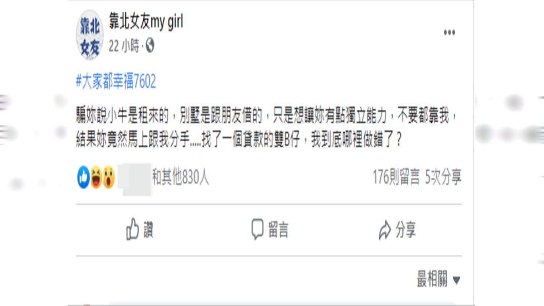 ▼原po在臉書社團「靠北女友my girl」發文說,他一心想要找到真愛,戀愛後為了讓女友多一點獨立的能力,不要凡事都靠他才能生存,就騙對方說小牛是租來的,別墅是跟朋友借,「結果妳竟然馬上跟我分手….找了一個貸款的雙B仔,我到底哪裡做錯了?」