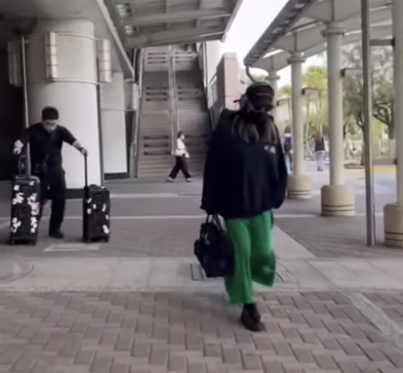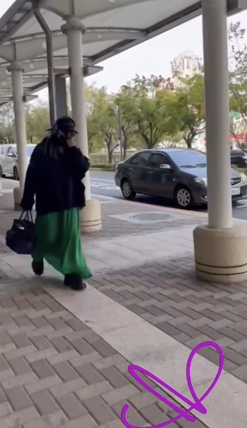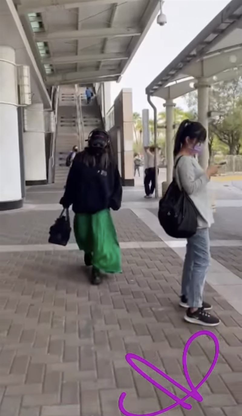 ▼阿妹現身左營高鐵站,她戴著黑色帽子和耳機,上半身全黑,下半身則穿著綠色長裙,整體搭配十分時尚。一路上她步伐很快,而且全程低頭看地板,路人似乎都沒有發現是阿妹。而後方有一位工作人員,幫她推著2個行李箱,展現出巨星的排場。
