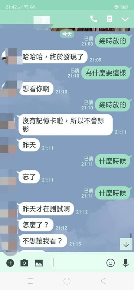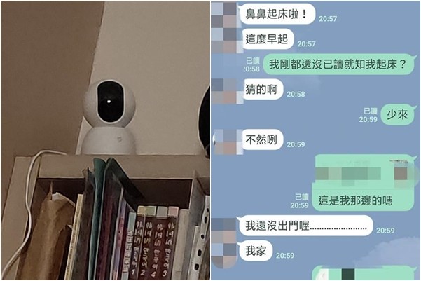 2023年10月28日日前一名女網友表示,有一天晚上男友在公司加班,她剛剛從床上醒來,就收到男友傳訊問「鼻鼻起床啦」,對方就連她順手關掉電風扇都知道。女網友四處查看,發現書櫃上放著一台監視器!她非常生氣,男友卻不以為意,還說:「哈哈哈,終於發現了,想看你啊。」