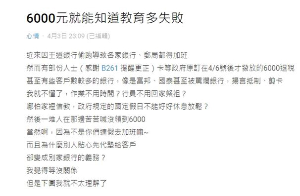 這名銀行員私訊向「靠北銀行員」粉絲專頁表示,近來因王道銀行偷跑導致各家銀行、郵局都得加班,然而有部份人士卡等政府原訂在4月6日後才發放的6000元現金,甚至有些客戶數比較多的銀行,像是富邦、國泰等被罵爛銀行,揚言抵制、剪卡。銀行員感覺很無奈,反問:「我就不懂了,作業不用時間?行員不用回家祭祖?」