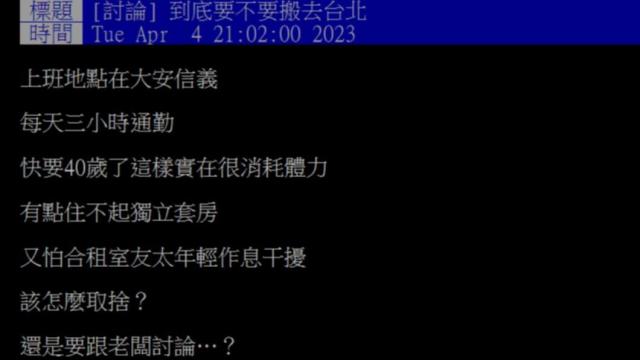 原po表示,她住新莊,上班地點在大安信義區,每天要花3小時的時間通勤,現在已經快要40歲,感覺實在很消耗體力。她租不起獨立套房,又怕合租室友太年輕,生活作息不合適,不知該如何取捨。原po感嘆:「以前巴不得在台北上班,現在真的在鬧區上班,身體卻說不要,該怎麼取捨?」