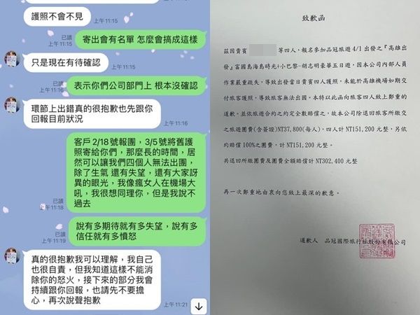 對此,品冠旅行社回應說,因為公司內部人員作業嚴重疏失,導致出發當日貴賓4人護照,未能於高雄機場如期交付,導致旅客無法出國,特此道歉,並依旅行合約之約定全數賠償,等於每人賠償3萬7800元,4人共計15萬1200元,再加上賠償100%的團費15萬1200元,共賠償30萬2400元,「再一次鄭重地由衷向您致上最深的歉意」。