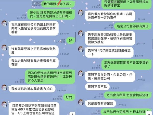 4月1日凌晨2時30分,原po一家4口從台北南下高雄,並於凌晨5時許抵達小港機場。他們一家是此旅行團最早抵達的,領隊卻說沒有他們的護照。原po立刻跟旅行社聯繫,對方說台北公司已於3月31日將護照寄往高雄,但高雄未與台北確認,目前不清楚包裹在哪。