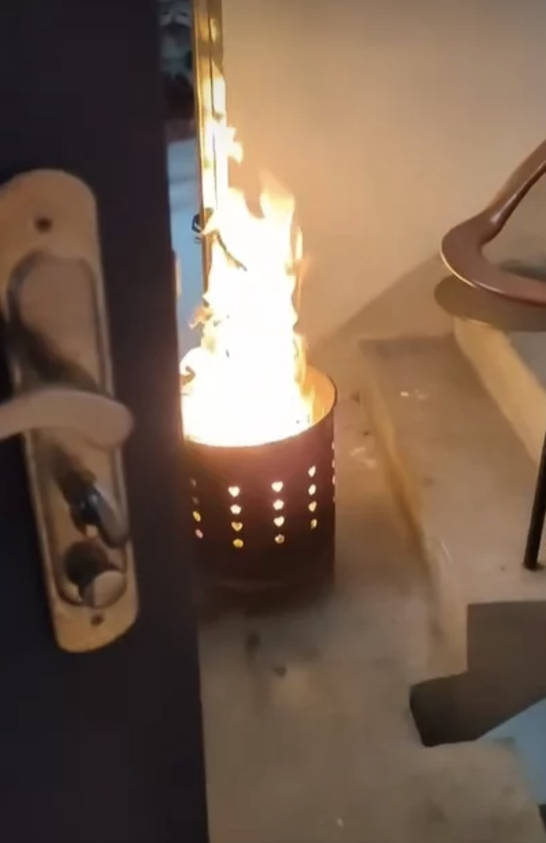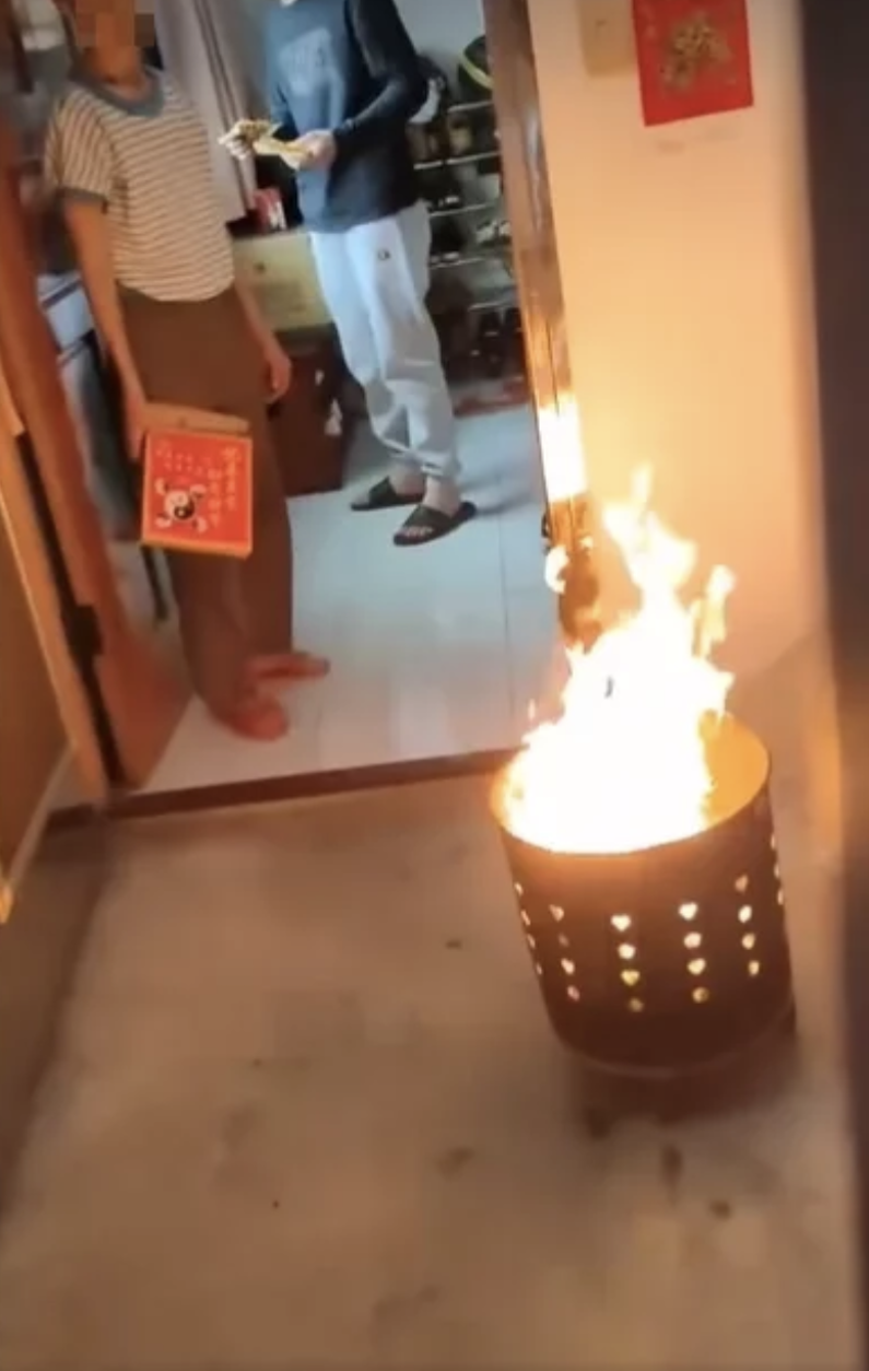 ▼原po在臉書社團「爆料公社」上傳一段影片,從畫面中可以看到,拍攝者打開自家大門,發現對面鄰居竟在樓梯間燒金紙,而且火勢很大,看起來十分危險。拍攝者好心勸告鄰居,卻被反嗆「我在我家門口燒,又不是在你家客廳燒」。原po無奈說:「超自私的老人家,在樓梯間燒金紙,又危險又臭死人。」