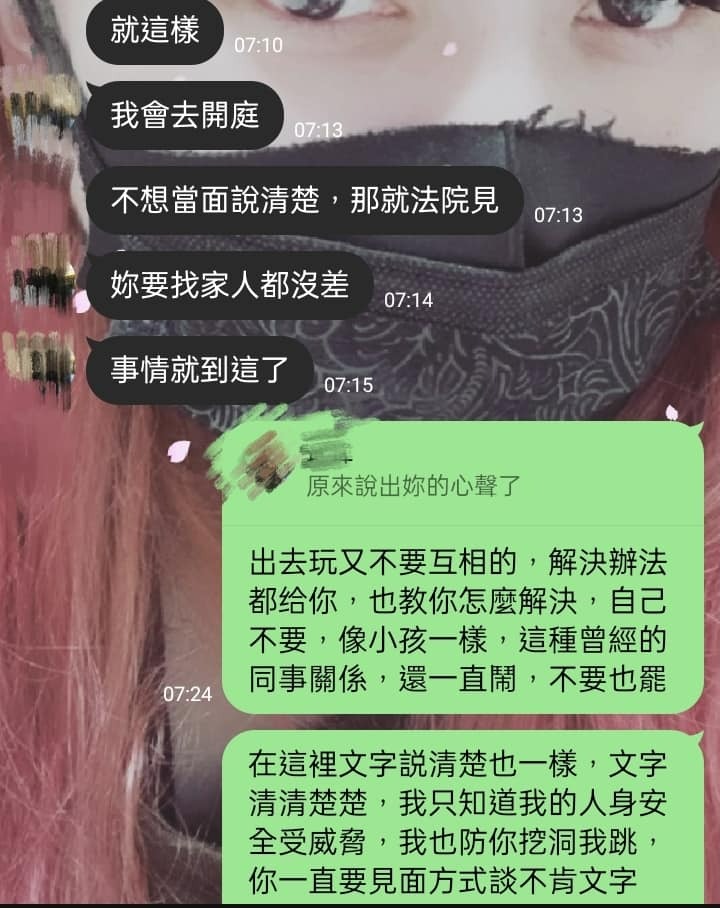 ▼事後同伴傳LINE訊息給原po:「反正不見面就法庭見」、「妳都不擔心我會不會回不了家耶」、「等我資料備足之後,妳就等著出庭,想鬧大就來,我不怕妳,當我好欺負就是了」。這些威脅的字眼令原po大傻眼:「環島帶伴真的要慎選,不然沒完沒了的八點檔上演不完。」