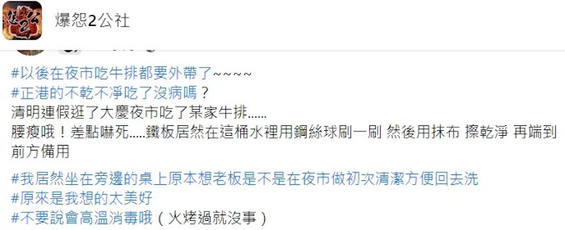 2023年04月12日日前一名女網友到台中大慶夜市某牛排攤用餐,發現店家竟用一桶汙濁不堪的髒水清洗碗盤。她被嚇到,趕緊將畫面錄下並po上網,迅速引發討論。對此,台中市食品藥物安全處表示,將派員於營業時間前往稽查;夜市管委會也表示「一經查證屬實,絕不姑息,要求該攤商不得繼續擺攤」。