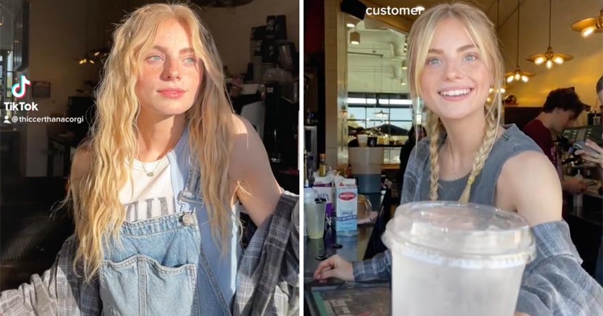 ▼這名女店員其實是一名叫Jenna的網紅,她經常在網路上分享自己的生活日常。最近她分享了一段自己在咖啡廳工作的影片,只見她面對客人露出一抹開朗的微笑,一頭蓬鬆的金髮顯得俏皮可愛。與客人對話時,她一會兒睜大雙眼、一會兒困惑皺眉,這些小表情非常靈動,簡直就像迪士尼公主來到了現實世界。