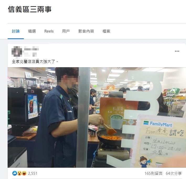 ▼原po在臉書社團「信義區三兩事」分享一張圖片,只見在一家全家便利商店中,店員竟在櫃檯旁架起卡式爐,用炒鍋翻炒年糕。原po看到這一幕忍不住說:「全家北醫店店員太強大了。」
