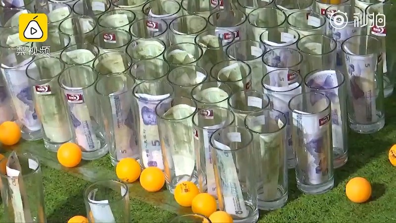 ▼楊博超在每個玻璃杯裡塞進1元到100元人民幣不等的紙鈔,客人花10元人民幣(約台幣45元)可以拿到10顆乒乓球,只要在指定位置將乒乓球投進玻璃杯,客人就能贏得玻璃杯中的紙鈔。最初楊博超只有一個人顧攤,沒想到生意越來越好,他又請了2名小幫手,每人工資200元人民幣(約台幣915元),一人主持現場活絡氣氛,另一人負責維持現場秩序。