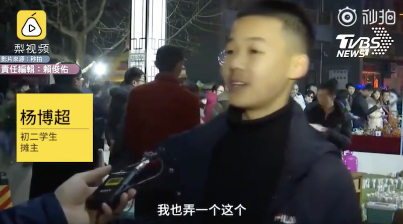 ▼這名叫楊博超的國二男生說,去年寒假時他在廣場看到類似的遊戲攤販,覺得這種賺錢方式自己也能試一試。今年他發現這種類型的攤販變少,於是興起擺攤賺錢的念頭。楊博超向媽媽借了800元人民幣,買來400個玻璃杯和300多個兵乓球,大年初八到廣場擺地攤。
