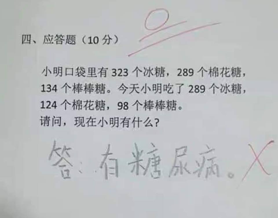 ▼原po在臉書社團「爆廢公社公開版」分享一題大陸數學應用題:「小明口袋裡有323個冰糖,289個棉花糖,134個棒棒糖。今天小明吃了289個冰糖,124個棉花糖,98個棒棒糖。請問,現在小明有什麼?」這題是希望學生能用減法算出小明有幾個冰糖、棉花糖和棒棒糖,但一名學生寫的答案卻是「有糖尿病」。