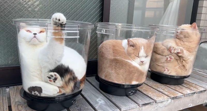 ▼從「jirosan77」分享的影片可以看到,橘白花色的「Tempura(てんぷら)」、奶油貓「Mikan(みかん)」和三花貓「Anmitsu(あんみつ)」,分別窩在一個透明盒子中,底盤正緩慢轉動。3隻貓咪安心睡懶覺,不用活動就能讓太陽曬滿全身,看起來超愜意。
