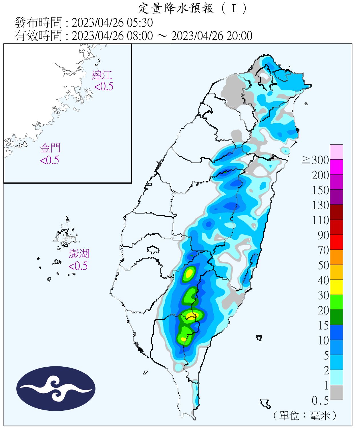 下週一(5/1日)、下週二(2日)東北季風減弱,轉為東風,氣溫逐日回升,東半部有局部短暫雨,午後山區有局部短暫陣雨。另外,本週五、週六西半部易有局部霧,週六馬祖亦有局部霧,大家請做好準備~