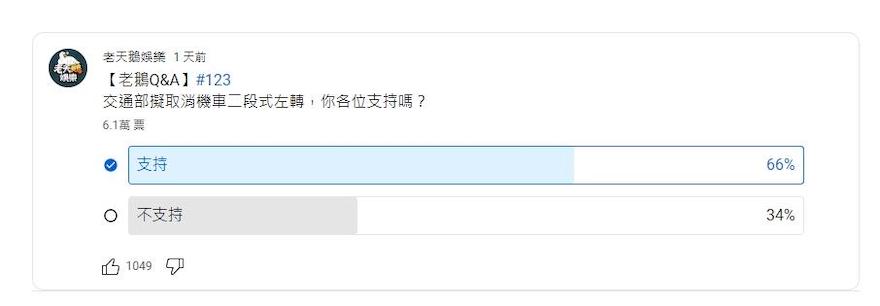 2023年05月03日為了改善機車事故,交通部擬部分取消機車兩段式左轉。近日Youtube頻道《老天鵝娛樂》發起「交通部擬取消機車二段式左轉,你各位支持嗎?」網路投票,短短幾天就有6萬多人參與,其中多達66%的網友支持取消,另外34%網友則不支持。