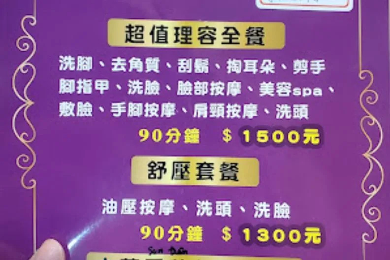 ▼對此,有內行的網友留言解答,1500元是「美容加全餐」的價錢,服務項目包括「洗腳、去角質、刮鬍子、掏耳朵、剪手腳指甲、臉部按摩spa、手腳頭頸按摩、洗臉、洗頭」,而且女客人還不少,並不是大家想像的「特別服務」。