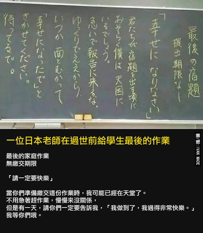 ▼黑板的開頭寫著「最後的功課,繳交期限:無」,左邊的文字則是「你們交作業的時候,我大概已經在天國了,所以不要急著來交作業,慢慢來就好」。最後這位老師話鋒一轉,又說:「等到哪天我們可以見面的時候,請你們讓我聽到『我過得很幸福』,我等你們。」
