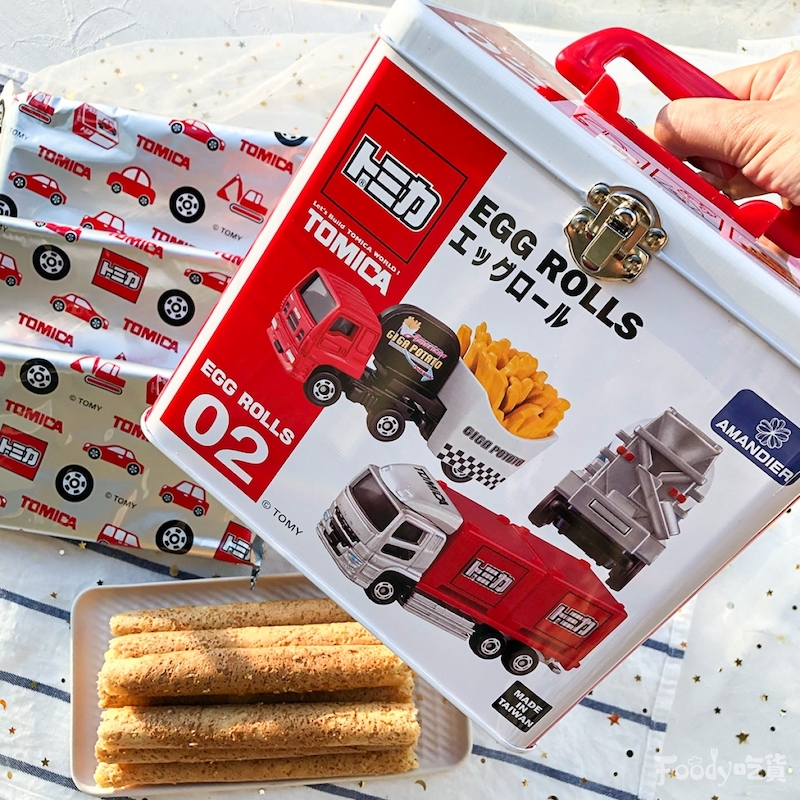 ▼「TOMICA原味手提蛋捲禮盒」,每一包蛋捲的外包裝上都印有經典車車圖鑑,手提鐵盒很有質感,還會附贈一盒童趣TOMICA撲克牌!蛋捲是用新鮮蛋液製作的,帶有濃濃的蛋香味和油酥香,越嚼越有味!恰到好處的煎焙蛋皮,捲成一層層的金黃色蛋捲,吃起來非常紮實,又酥脆爽口!原價490元,特價優惠只要349元!