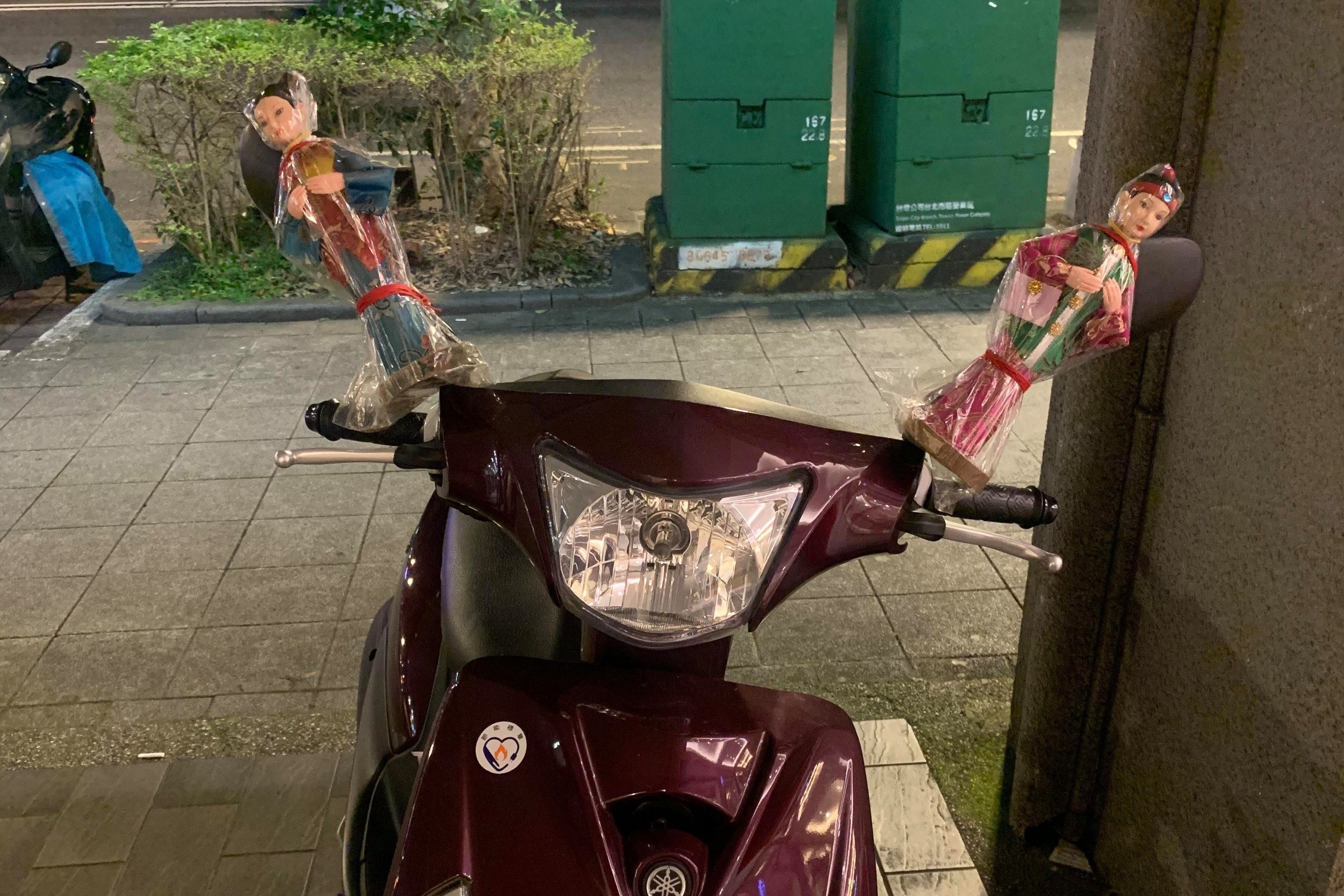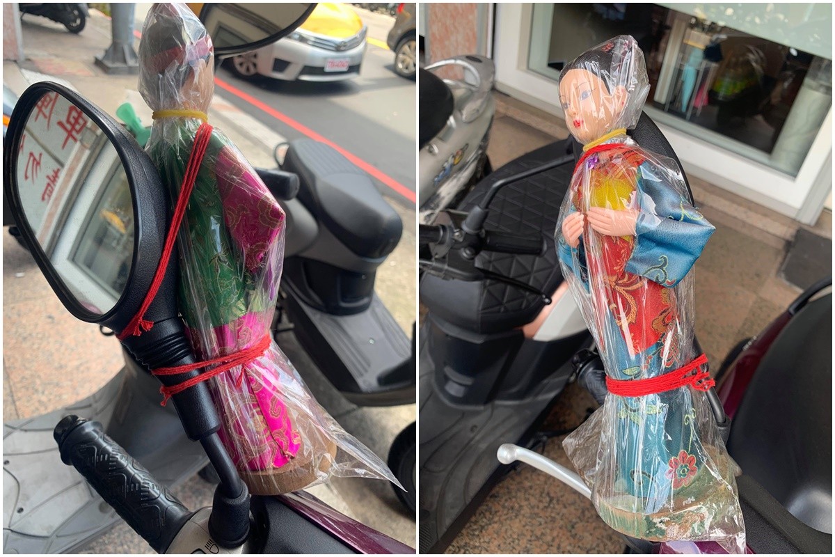 ▼原po在臉書社團「爆怨公社」發文說,自己是一個開導航語音都會迷路的人,熱心的學長不僅幫忙報路,還在她的機車後照鏡綁上一對「金童玉女」幫她指引方向。不過學長的好意卻讓她越騎越不對勁,「路人的眼神讓我渾身發毛,這完全符合移動式神主牌啊」。