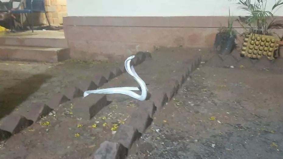 ▼這隻白蛇雖然美麗,卻十分危險。原來牠是劇毒眼鏡蛇,被牠咬到可能致命。那戶人家通知捕蛇人前來抓蛇,最後在野生動物與自然保護基金會(Wildlife & Nature Conservation Trust,WNCT)工作人員的努力下,白蛇被成功捕獲,交由當地政府相關部門處理後續事宜。