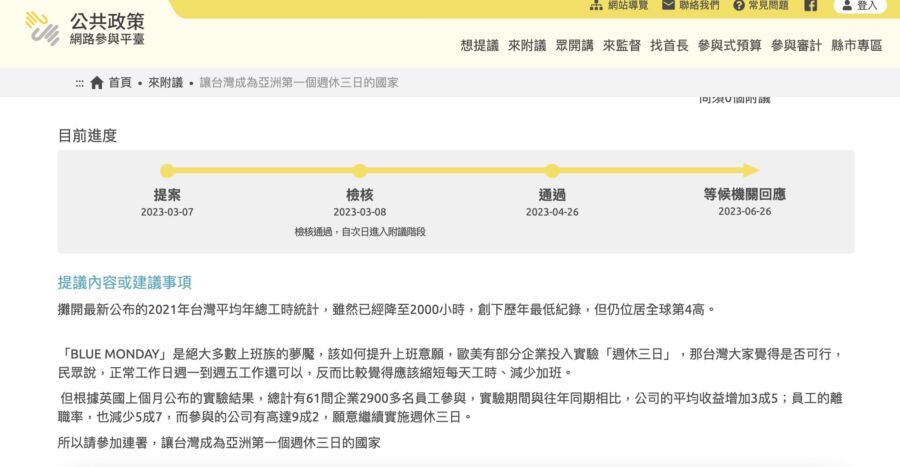 提案經過檢核後,60天的附議時間內需完成5000份,才可獲得成案。「週休3日」提案在短短1個多月後就有5000多人附議,主管政府機關將於2個月內具體回應,時限落在6月26日,將透過平台回應。