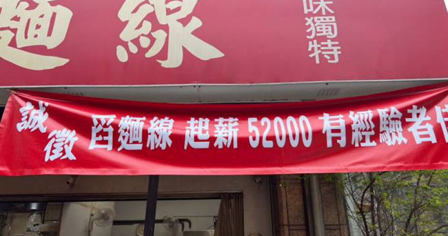 2023年05月17日台北市大安區一間知名麵線攤在門口貼出徵人布條,上面寫著「誠徵舀麵線起薪52000,有經驗者佳」,但公告貼出2、3週仍沒有找到人。老闆無奈透露,不僅開52K找不到人,前一個「舀麵線」離職員工的薪水高達7萬,但還是留不住人。